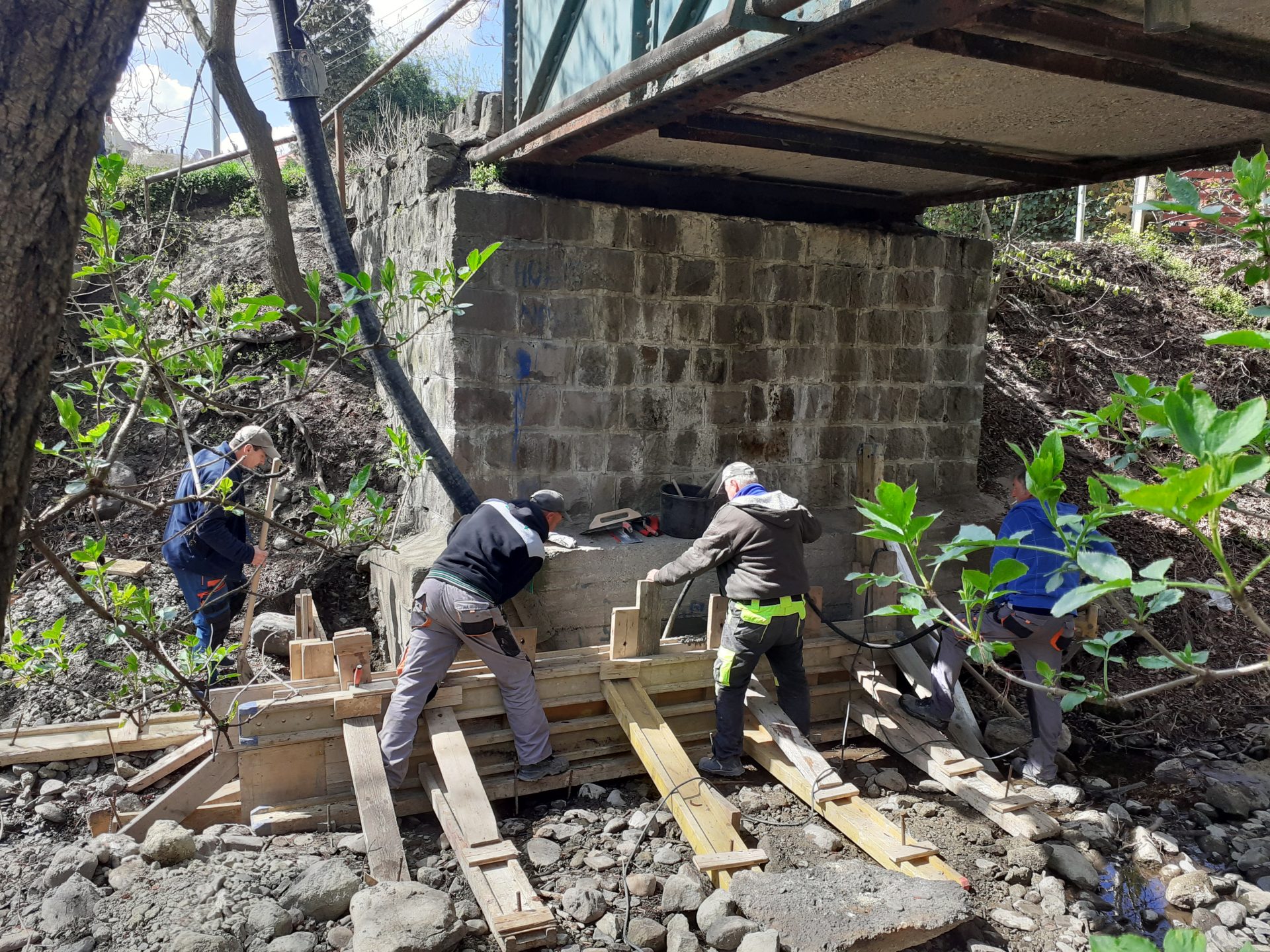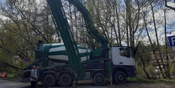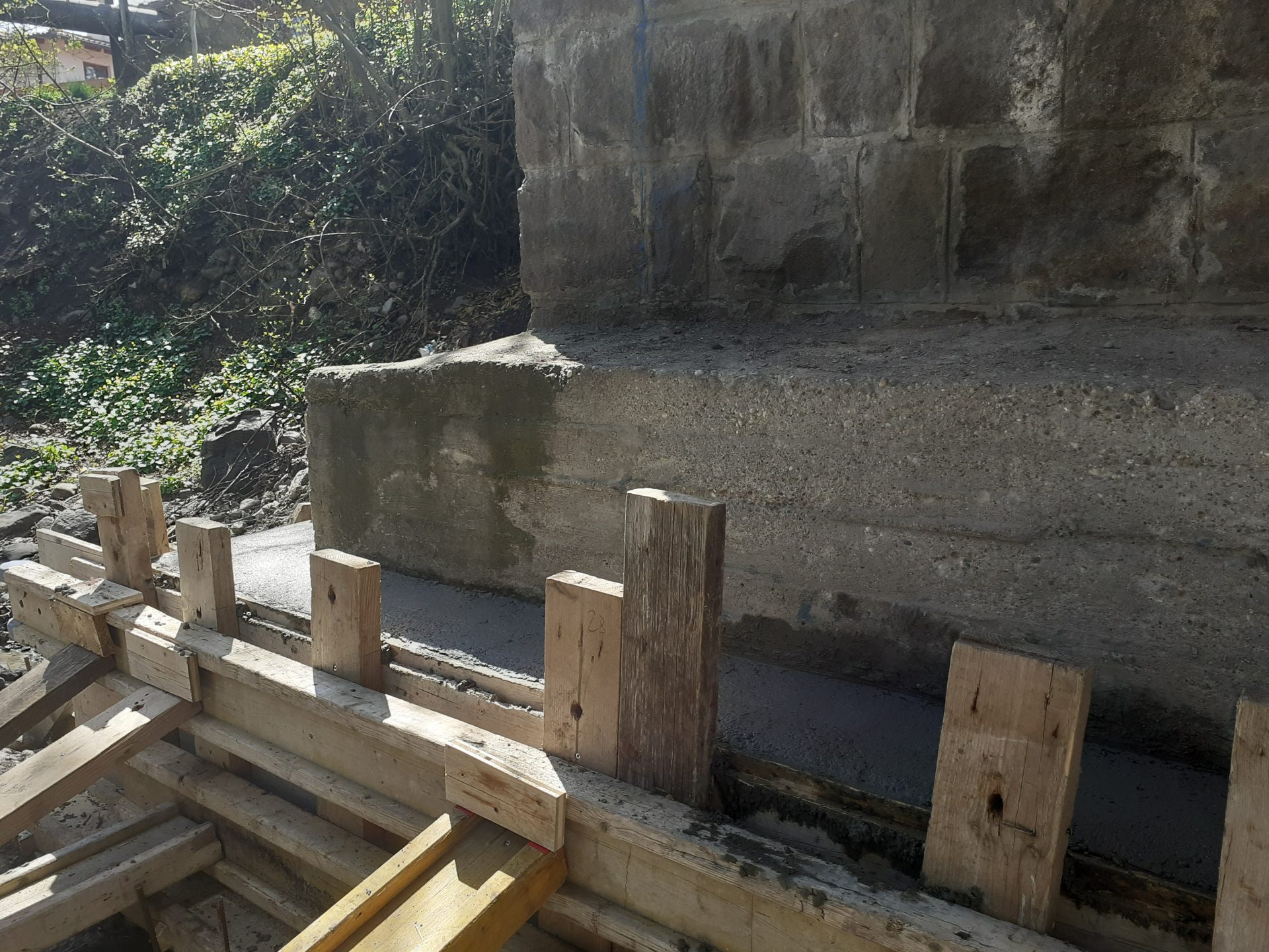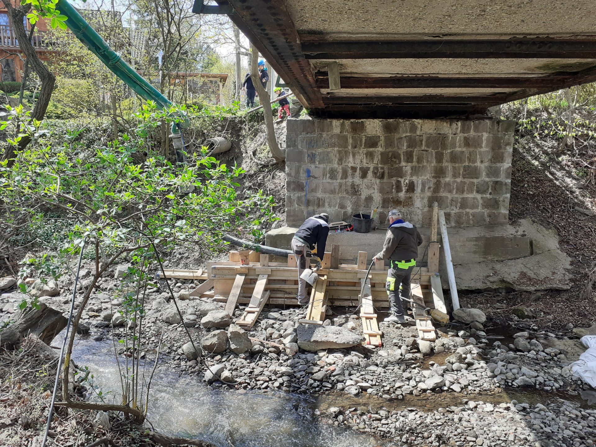 Az alábetonozás pumpálásos technológiával történt. A mixerautó mintegy 28 méteres gémjét sikerült átvezetni a bal partról, a Kovács László utcai parkolóból a patak fölött, a fák ágai között a jobb parti pillérhez. Így a mintegy két köbméter betont 20 perc alatt a helyére pumpálta a mixerautó. A beton hétnapos szilárdulása után folytatódik a munka a pillér másik felén, a régi betonszoknya leverésével, a pillér alatti rész tisztításával, zsaluzással és végül annak alábetonozásával.