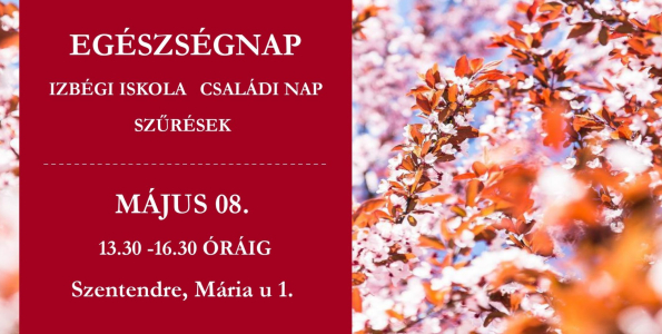 Egészségnapot szervez az Egészséges Városért Közalapítvány Szentendre 2026. május 8-án, pénteken az Izbégi Általános Iskola Családi Napjának keretében. Az egészségnapon igénybe vehető szűrések ingyenesek, a részvétel előzetes regisztrációhoz kötött.
