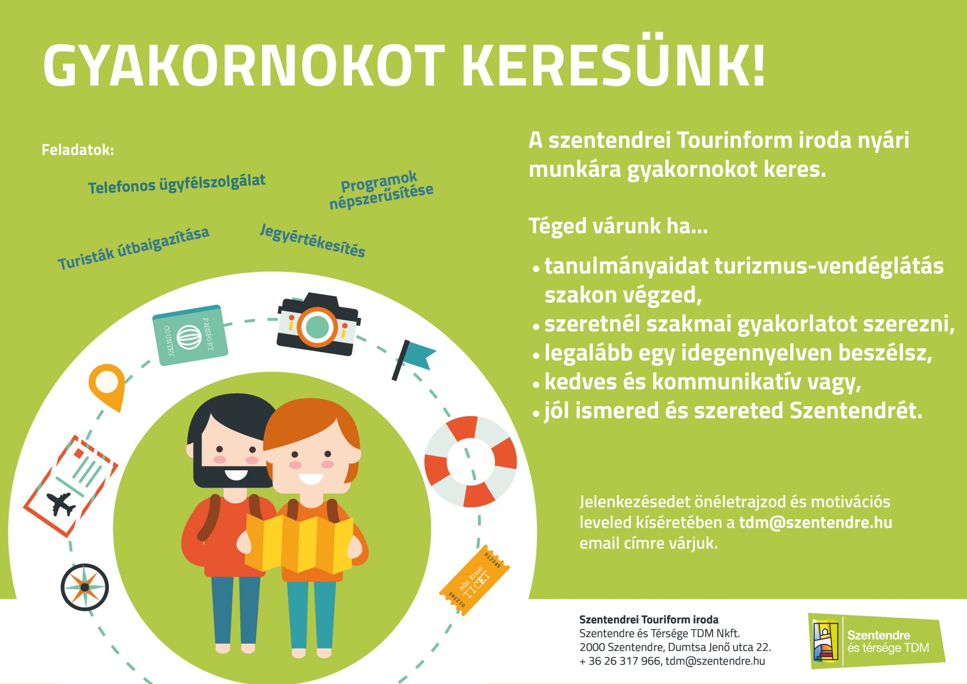 A nyári időszakra a Szentendrei Tourinform Iroda – elsősorban turisztikai felsőoktatási képzésben részt vevő – fiatalokat keres gyakornoki munkára az irodába. Részletek a mellékelt szórólapon. A jelentkezéseket a tdm@szentendre.hu címre várják.
