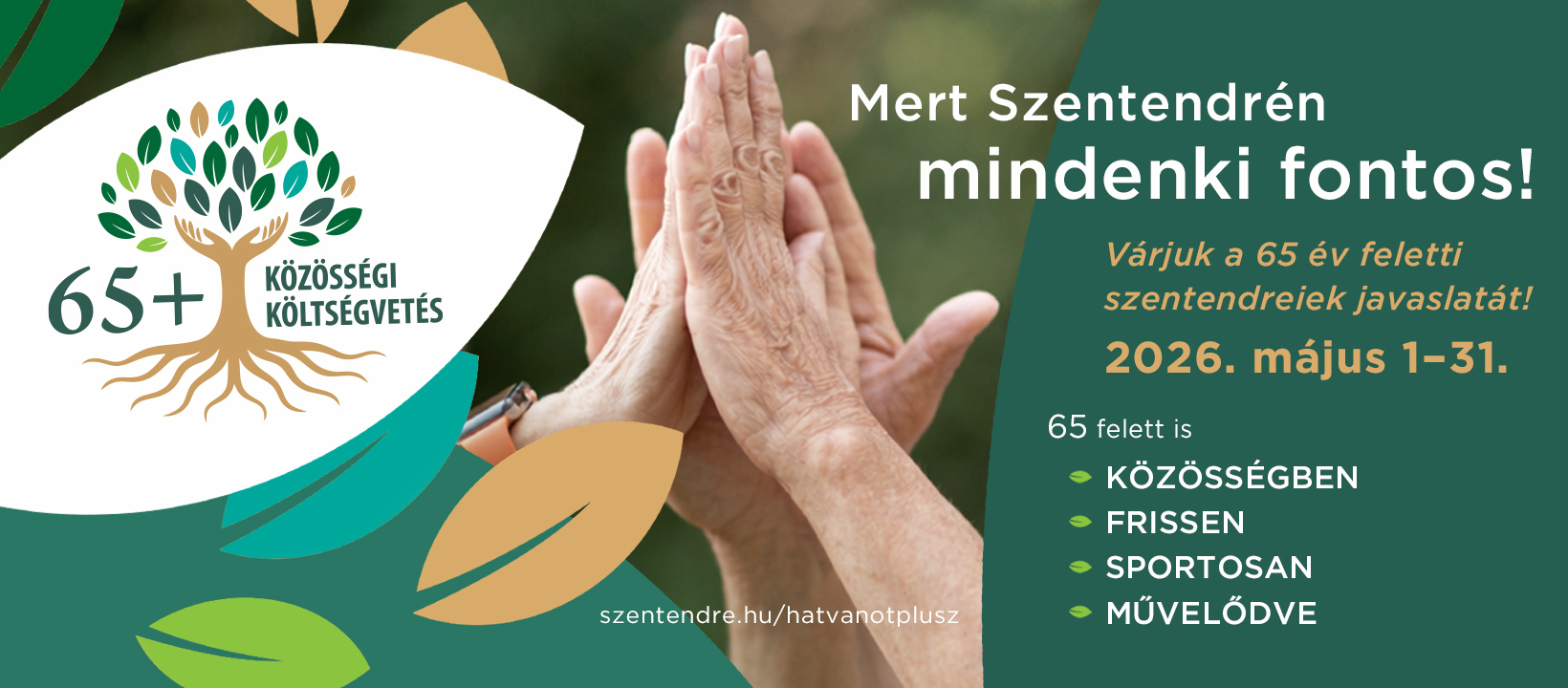 Szentendre Város Önkormányzata az Európában egyedülálló 65+ Közösségi Részvételi Költségvetés programban a Szentendrén élő 65 év felettieket javaslatait várja. A résztvevők a program keretében megfogalmazhatják életminőségük, jóllétük javítását célzó ötleteiket, kifejezhetik, hogy mire lenne korosztályuknak, közösségeiknek szüksége ahhoz, hogy jobban érezzék magukat a városban. A beérkezett javaslatokból a legjobbak megvalósítását Szentendre Város Önkormányzata 5 millió forinttal támogatja.