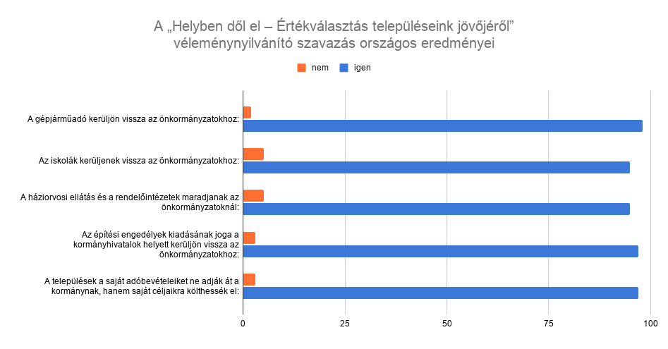 Az ország 740 településéről érkező szavazatok összesítése alapján a Magyar Önkormányzatok Szövetsége (MÖSZ) kérdéseire válaszolók nagy többsége, mind az öt kérdés esetében 90%-ot jóval meghaladó arányban támogatta, hogy a magyar települések kapják vissza jogaikat és lehetőségeiket, és a hétköznapokat befolyásoló legfontosabb ügyekről helyben dönthessenek.