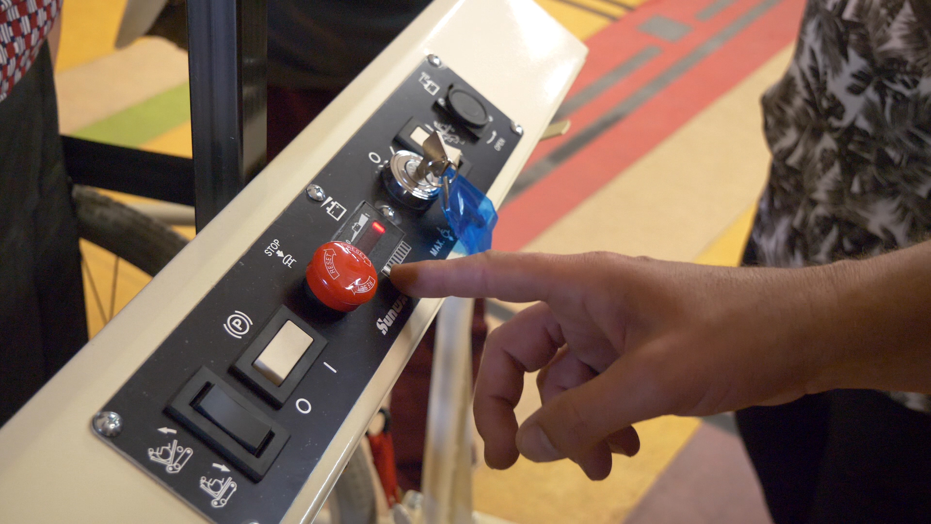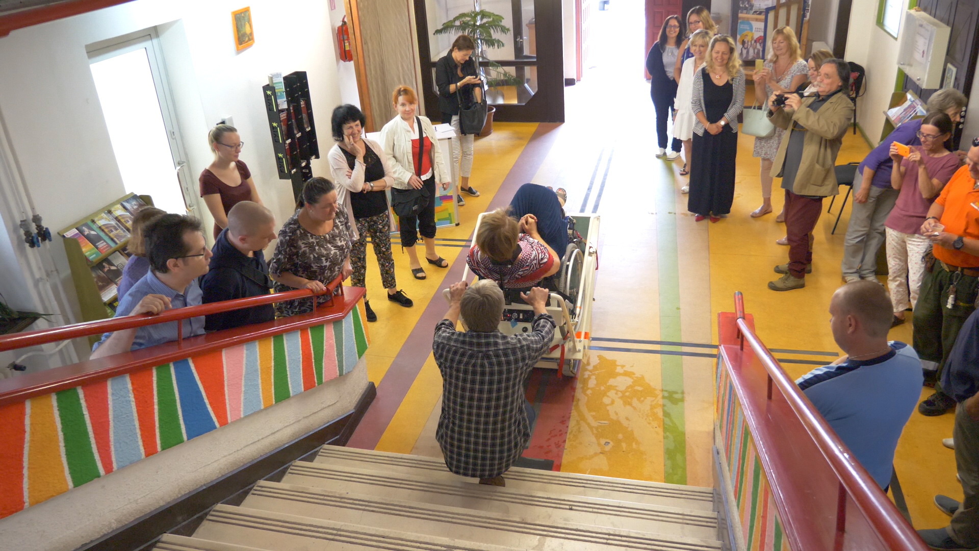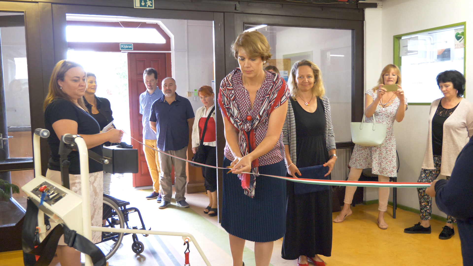 Gyürk Dorottya mindjárt ki is próbálta a japán gyártmányú lépcsőjárót. Hamvas Béla (nem elírás!), a járművet forgalmazó cég ügyvezetője betolta a kerekes székkel együtt a járműbe, gyorsoldós rögzítővel fixálta, majd elindította az egy személy közreműködésével kényelmesen és biztonságosan irányítható szerkezetet, majd a kezelését bemutatta a polgármesteri hivatal, az ügyfélszolgálat és a P’Art Mozi munkatársainak is. Az akkumulátorral működő lépcsőjáró helye a Fehérházban lesz, szükség esetén innen szállítható át a város más helyszíneire.