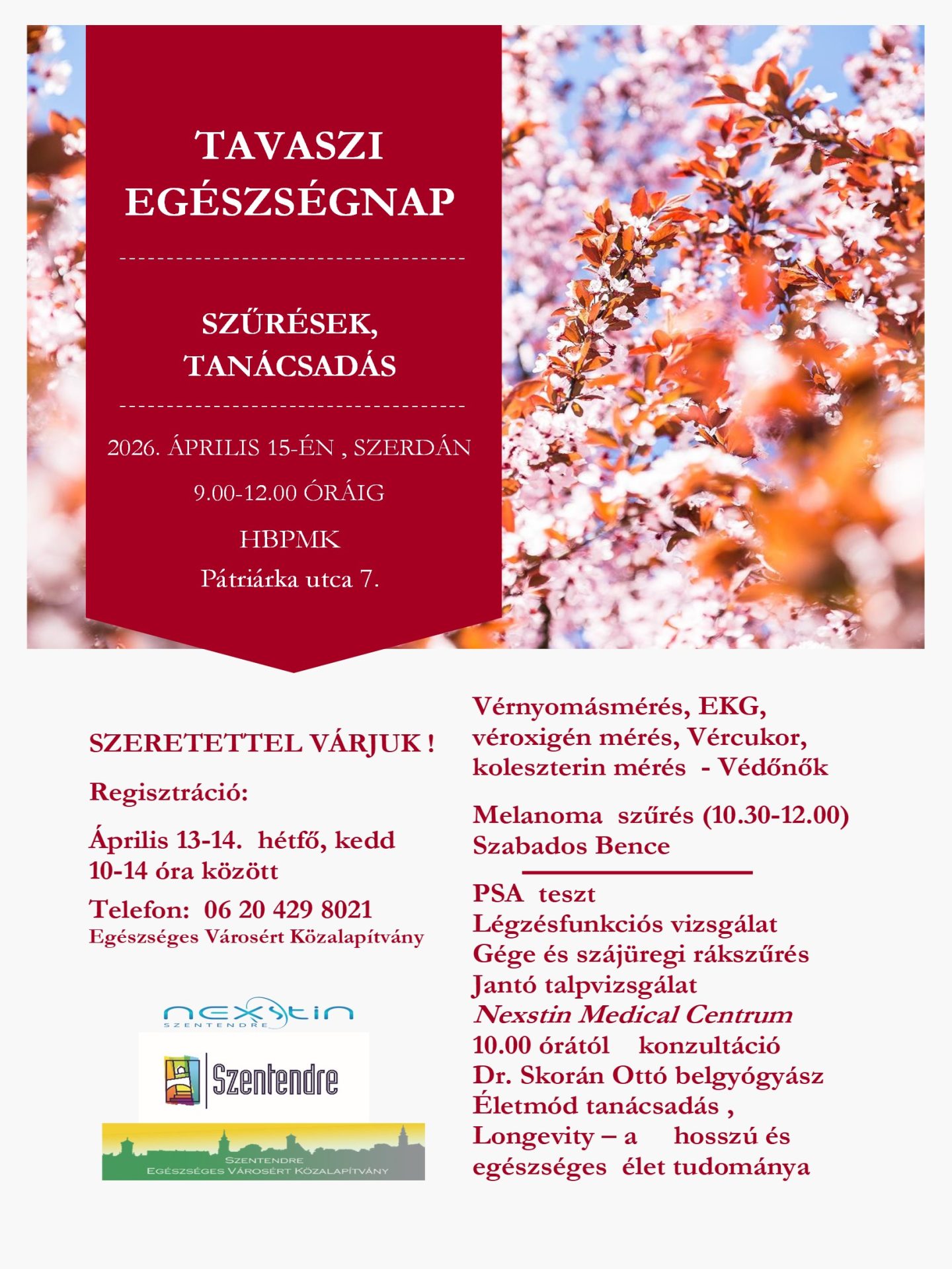 Tavaszi egészségnapot szervez az Egészséges Városért Közalapítvány Szentendre 2026. április 15., szerdára a Hamvas Béla Pest Megyei Könyvtárba. Az egészségnapon igénybe vehető szűrések ingyenesek, a részvétel előzetes regisztrációhoz kötött.